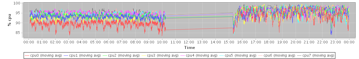 avg(cpu0) = 91.56 avg(cpu1) = 94.12 avg(cpu2) = 94.45 avg(cpu3) = 93.77 avg(cpu4) = 95.20 avg(cpu5) = 94.91 avg(cpu6) = 94.80 avg(cpu7) = 95.25