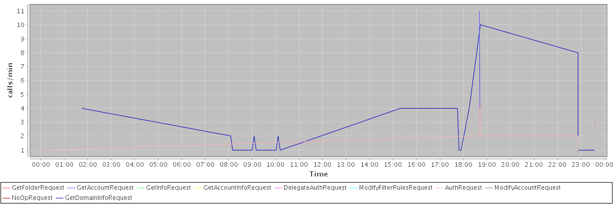 max(GetFolderRequest) = 3.00 max(GetAccountRequest) = 11.00 max(GetInfoRequest) = 3.00 max(GetAccountInfoRequest) = 3.00 max(DelegateAuthRequest) = 3.00 max(ModifyFilterRulesRequest) = 1.00 max(AuthRequest) = 6.00 max(ModifyAccountRequest) = 8.00 max(NoOpRequest) = 1.00 max(GetDomainInfoRequest) = 10.00