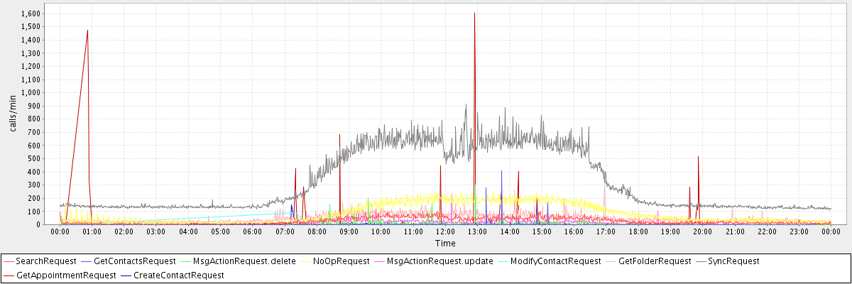 max(SearchRequest) = 112.00 max(GetContactsRequest) = 409.00 max(MsgActionRequest.delete) = 299.00 max(NoOpRequest) = 257.00 max(MsgActionRequest.update) = 160.00 max(ModifyContactRequest) = 89.00 max(GetFolderRequest) = 298.00 max(SyncRequest) = 917.00 max(GetAppointmentRequest) = 1601.00 max(CreateContactRequest) = 153.00