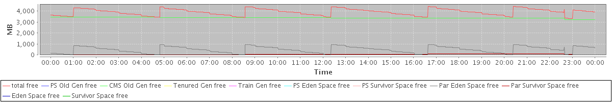 avg(total free) = 3924.48 avg(PS Old Gen free) = 0.00 avg(CMS Old Gen free) = 3394.24 avg(Tenured Gen free) = 0.00 avg(Train Gen free) = 0.00 avg(PS Eden Space free) = 0.00 avg(PS Survivor Space free) = 0.00 avg(Par Eden Space free) = 482.74 avg(Par Survivor Space free) = 47.50 avg(Eden Space free) = 0.00 avg(Survivor Space free) = 0.00