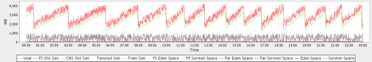 avg(total) = 2943.66 avg(PS Old Gen) = 0.00 avg(CMS Old Gen) = 2383.01 avg(Tenured Gen) = 0.00 avg(Train Gen) = 0.00 avg(PS Eden Space) = 0.00 avg(PS Survivor Space) = 0.00 avg(Par Eden Space) = 476.08 avg(Par Survivor Space) = 84.56 avg(Eden Space) = 0.00 avg(Survivor Space) = 0.00