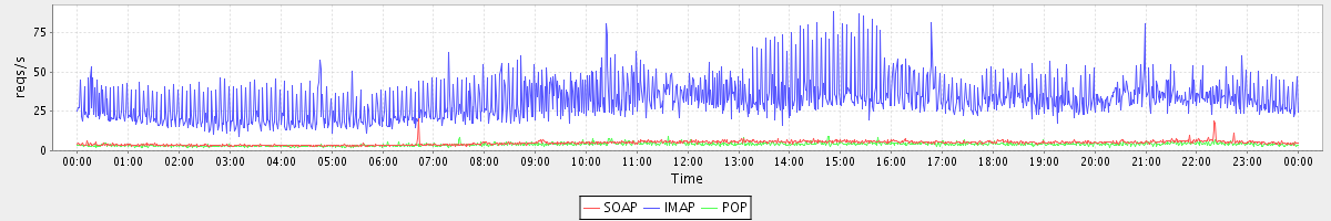 Host zm08.stanford.edu: Mailboxd: Request Rate by Client Protocol
