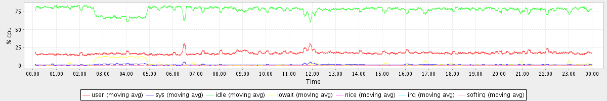 avg(user) = 17.69 avg(sys) = 1.57 avg(idle) = 77.68 avg(iowait) = 2.51 avg(nice) = 0.00 avg(irq) = 0.03 avg(softirq) = 0.51
