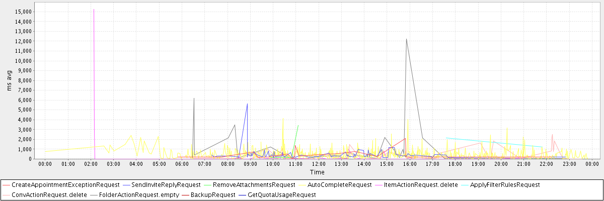 avg(CreateAppointmentExceptionRequest) = 483.47 avg(SendInviteReplyRequest) = 441.31 avg(RemoveAttachmentsRequest) = 956.25 avg(AutoCompleteRequest) = 468.70 avg(ItemActionRequest.delete) = 404.56 avg(ApplyFilterRulesRequest) = 1706.50 avg(ConvActionRequest.delete) = 534.49 avg(FolderActionRequest.empty) = 1058.52 avg(BackupRequest) = 6739.00 avg(GetQuotaUsageRequest) = 974.00