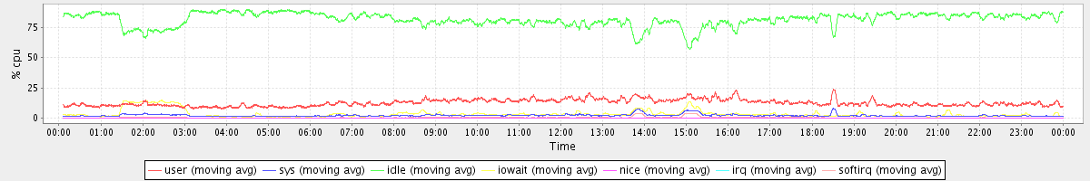 avg(user) = 12.55 avg(sys) = 2.10 avg(idle) = 81.63 avg(iowait) = 3.31 avg(nice) = 0.00 avg(irq) = 0.01 avg(softirq) = 0.39