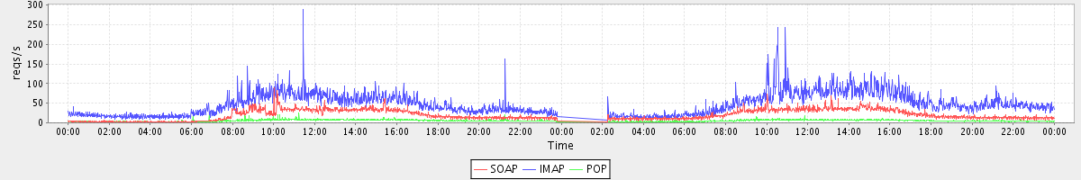 Host zm04.stanford.edu: Mailboxd: Request Rate by Client Protocol