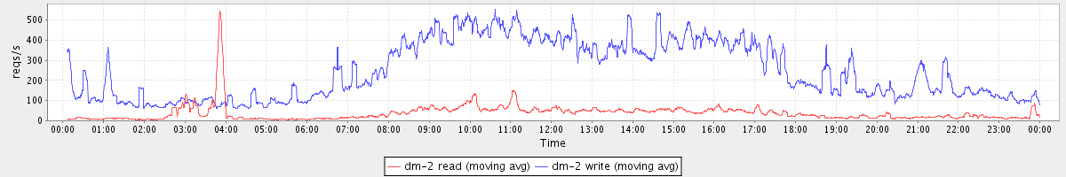 avg(dm-2 read) = 544.79 avg(dm-2 write) = 1401.49