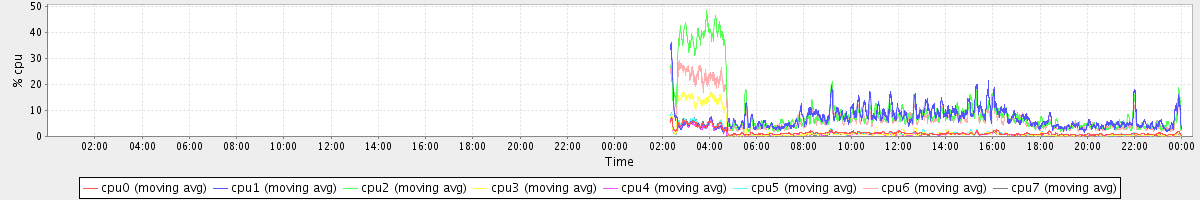 avg(cpu0) = 1.59 avg(cpu1) = 0.33 avg(cpu2) = 0.37 avg(cpu3) = 0.26 avg(cpu4) = 0.21 avg(cpu5) = 0.23 avg(cpu6) = 0.30 avg(cpu7) = 0.21