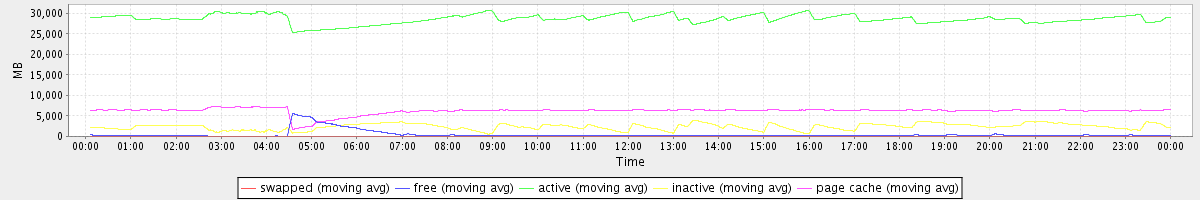 avg(swapped) = 0.25 avg(free) = 444.78 avg(active) = 28648.35 avg(inactive) = 2364.19 avg(page cache) = 6212.84