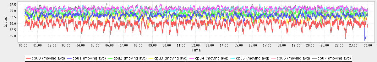 avg(cpu0) = 89.84 avg(cpu1) = 93.11 avg(cpu2) = 93.67 avg(cpu3) = 92.79 avg(cpu4) = 95.83 avg(cpu5) = 95.31 avg(cpu6) = 94.91 avg(cpu7) = 95.44