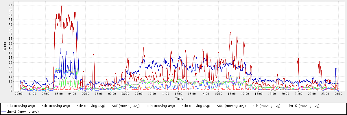 avg(sda) = 1.87 avg(sdc) = 4.71 avg(sde) = 5.88 avg(sdf) = 4.77 avg(sdn) = 5.85 avg(sdo) = 4.74 avg(sdq) = 5.86 avg(sdr) = 4.74 avg(dm-0) = 17.76 avg(dm-2) = 17.21