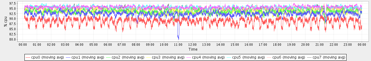 avg(cpu0) = 88.80 avg(cpu1) = 92.39 avg(cpu2) = 93.43 avg(cpu3) = 93.40 avg(cpu4) = 95.60 avg(cpu5) = 95.59 avg(cpu6) = 94.85 avg(cpu7) = 94.84