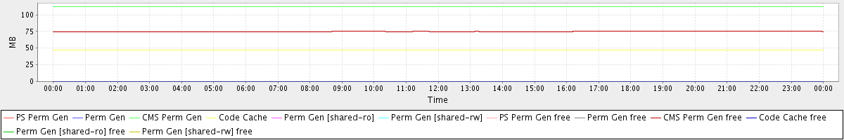 avg(PS Perm Gen) = 0.00 avg(Perm Gen) = 0.00 avg(CMS Perm Gen) = 112.05 avg(Code Cache) = 47.52 avg(Perm Gen [shared-ro]) = 0.00 avg(Perm Gen [shared-rw]) = 0.00 avg(PS Perm Gen free) = 0.00 avg(Perm Gen free) = 0.00 avg(CMS Perm Gen free) = 74.85 avg(Code Cache free) = 0.29 avg(Perm Gen [shared-ro] free) = 0.00 avg(Perm Gen [shared-rw] free) = 0.00
