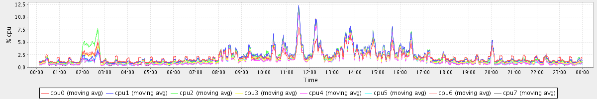 avg(cpu0) = 1.19 avg(cpu1) = 0.31 avg(cpu2) = 0.34 avg(cpu3) = 0.23 avg(cpu4) = 0.19 avg(cpu5) = 0.19 avg(cpu6) = 0.25 avg(cpu7) = 0.22