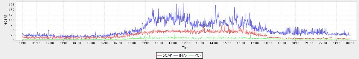 Host zm05.stanford.edu: Mailboxd: Request Rate by Client Protocol