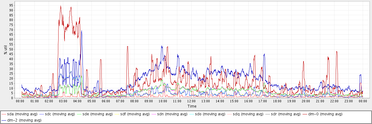 avg(sda) = 2.03 avg(sdc) = 4.47 avg(sde) = 6.00 avg(sdf) = 4.48 avg(sdn) = 6.02 avg(sdo) = 4.48 avg(sdq) = 6.02 avg(sdr) = 4.42 avg(dm-0) = 16.68 avg(dm-2) = 17.59