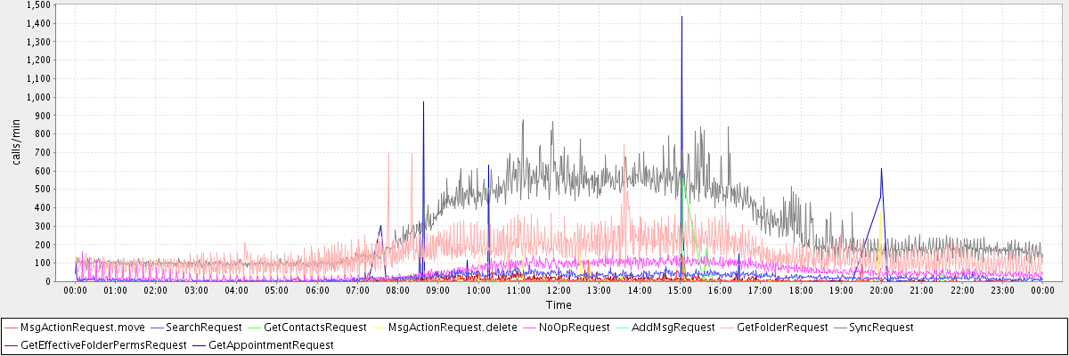 max(MsgActionRequest.move) = 139.00 max(SearchRequest) = 97.00 max(GetContactsRequest) = 561.00 max(MsgActionRequest.delete) = 376.00 max(NoOpRequest) = 166.00 max(AddMsgRequest) = 105.00 max(GetFolderRequest) = 746.00 max(SyncRequest) = 879.00 max(GetEffectiveFolderPermsRequest) = 185.00 max(GetAppointmentRequest) = 1435.00