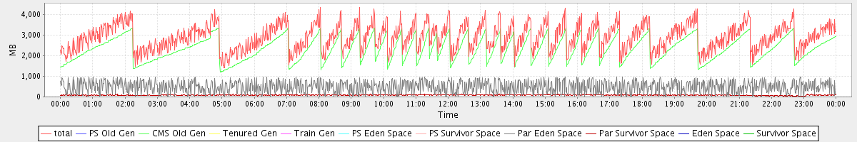 avg(total) = 2899.11 avg(PS Old Gen) = 0.00 avg(CMS Old Gen) = 2322.69 avg(Tenured Gen) = 0.00 avg(Train Gen) = 0.00 avg(PS Eden Space) = 0.00 avg(PS Survivor Space) = 0.00 avg(Par Eden Space) = 491.05 avg(Par Survivor Space) = 85.37 avg(Eden Space) = 0.00 avg(Survivor Space) = 0.00