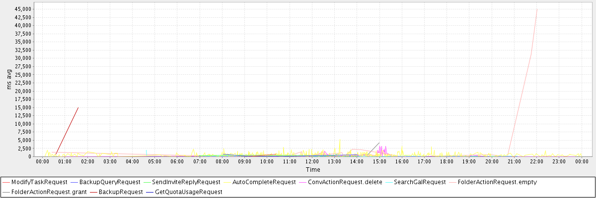 avg(ModifyTaskRequest) = 245.67 avg(BackupQueryRequest) = 358.60 avg(SendInviteReplyRequest) = 413.50 avg(AutoCompleteRequest) = 535.96 avg(ConvActionRequest.delete) = 519.90 avg(SearchGalRequest) = 309.33 avg(FolderActionRequest.empty) = 4412.65 avg(FolderActionRequest.grant) = 1183.50 avg(BackupRequest) = 7830.50 avg(GetQuotaUsageRequest) = 2238.00