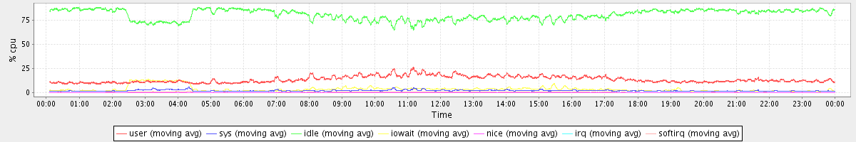 avg(user) = 13.59 avg(sys) = 1.98 avg(idle) = 80.44 avg(iowait) = 3.62 avg(nice) = 0.00 avg(irq) = 0.02 avg(softirq) = 0.35