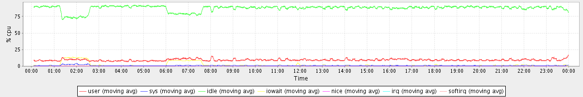 avg(user) = 9.31 avg(sys) = 0.97 avg(idle) = 87.47 avg(iowait) = 2.04 avg(nice) = 0.00 avg(irq) = 0.01 avg(softirq) = 0.20
