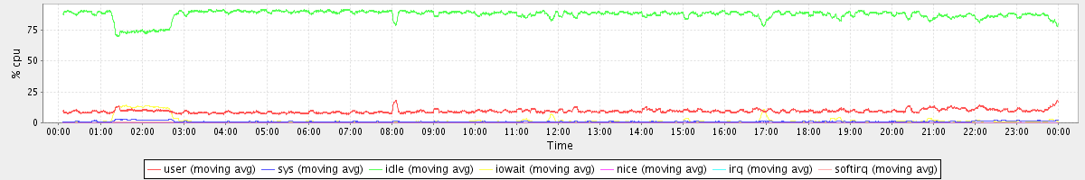 avg(user) = 9.43 avg(sys) = 1.03 avg(idle) = 87.52 avg(iowait) = 1.80 avg(nice) = 0.00 avg(irq) = 0.01 avg(softirq) = 0.20