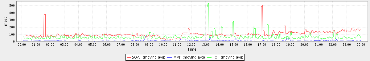 avg(SendMsgRequest) = 279.14 avg(BackupQueryRequest) = 214.67 avg(GetFreeBusyRequest) = 256.67 avg(CancelAppointmentRequest) = 247.44 avg(RemoveAttachmentsRequest) = 248.00 avg(AutoCompleteRequest) = 467.40 avg(ApplyFilterRulesRequest) = 238695.33 avg(FolderActionRequest.empty) = 1683.56 avg(BackupRequest) = 3940.00 avg(GetQuotaUsageRequest) = 993.00