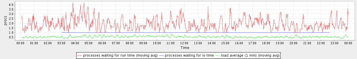 avg(processes waiting for run time) = 0.77 avg(processes waiting for io time) = 0.00 avg(load average (1 min)) = 0.55