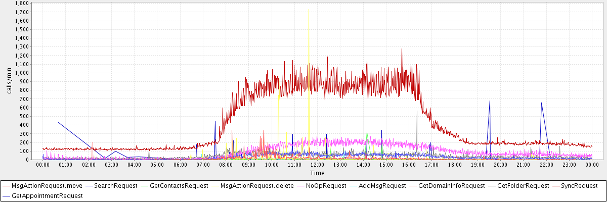 max(MsgActionRequest.move) = 340.00 max(SearchRequest) = 114.00 max(GetContactsRequest) = 316.00 max(MsgActionRequest.delete) = 1729.00 max(NoOpRequest) = 266.00 max(AddMsgRequest) = 117.00 max(GetDomainInfoRequest) = 203.00 max(GetFolderRequest) = 565.00 max(SyncRequest) = 1279.00 max(GetAppointmentRequest) = 682.00