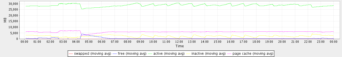 avg(swapped) = 0.25 avg(free) = 438.83 avg(active) = 28675.50 avg(inactive) = 2329.99 avg(page cache) = 6017.62