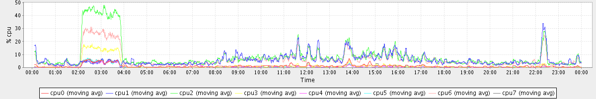 avg(cpu0) = 21.32 avg(cpu1) = 11.25 avg(cpu2) = 11.01 avg(cpu3) = 10.94 avg(cpu4) = 8.10 avg(cpu5) = 9.89 avg(cpu6) = 9.97 avg(cpu7) = 9.81