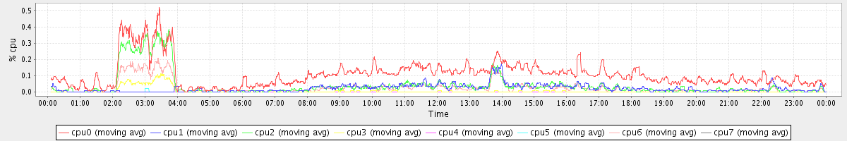 avg(cpu0) = 0.11 avg(cpu1) = 0.02 avg(cpu2) = 0.04 avg(cpu3) = 0.01 avg(cpu4) = 0.00 avg(cpu5) = 0.00 avg(cpu6) = 0.02 avg(cpu7) = 0.00