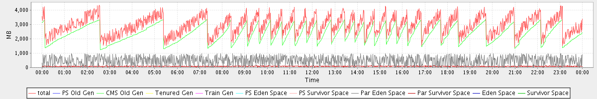 avg(total) = 2923.60 avg(PS Old Gen) = 0.00 avg(CMS Old Gen) = 2351.73 avg(Tenured Gen) = 0.00 avg(Train Gen) = 0.00 avg(PS Eden Space) = 0.00 avg(PS Survivor Space) = 0.00 avg(Par Eden Space) = 486.98 avg(Par Survivor Space) = 84.89 avg(Eden Space) = 0.00 avg(Survivor Space) = 0.00