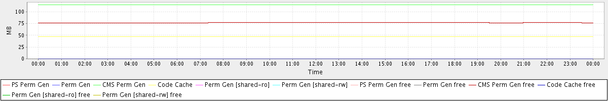 avg(PS Perm Gen) = 0.00 avg(Perm Gen) = 0.00 avg(CMS Perm Gen) = 114.72 avg(Code Cache) = 47.54 avg(Perm Gen [shared-ro]) = 0.00 avg(Perm Gen [shared-rw]) = 0.00 avg(PS Perm Gen free) = 0.00 avg(Perm Gen free) = 0.00 avg(CMS Perm Gen free) = 76.63 avg(Code Cache free) = 0.39 avg(Perm Gen [shared-ro] free) = 0.00 avg(Perm Gen [shared-rw] free) = 0.00