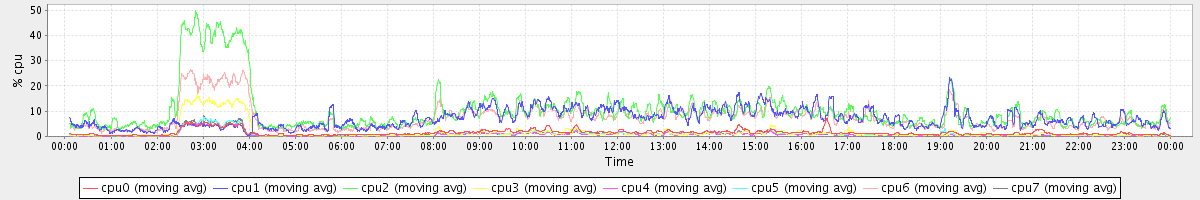 avg(cpu0) = 1.31 avg(cpu1) = 0.26 avg(cpu2) = 0.30 avg(cpu3) = 0.18 avg(cpu4) = 0.13 avg(cpu5) = 0.15 avg(cpu6) = 0.22 avg(cpu7) = 0.17