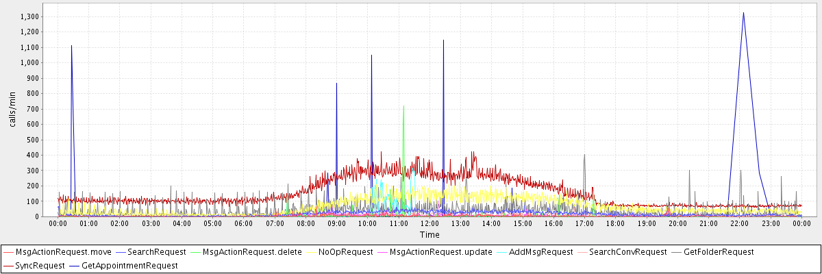 max(MsgActionRequest.move) = 67.00 max(SearchRequest) = 69.00 max(MsgActionRequest.delete) = 718.00 max(NoOpRequest) = 220.00 max(MsgActionRequest.update) = 102.00 max(AddMsgRequest) = 317.00 max(SearchConvRequest) = 63.00 max(GetFolderRequest) = 403.00 max(SyncRequest) = 422.00 max(GetAppointmentRequest) = 1323.00