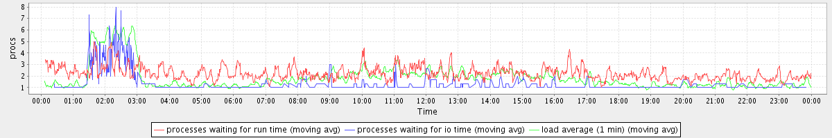 avg(processes waiting for run time) = 1.49 avg(processes waiting for io time) = 0.40 avg(load average (1 min)) = 1.84