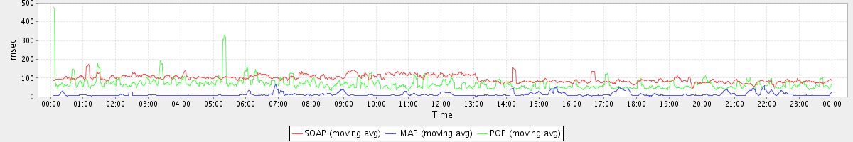 avg(SendMsgRequest) = 200.84 avg(BackupQueryRequest) = 273.40 avg(GetFreeBusyRequest) = 1460.78 avg(SendInviteReplyRequest) = 242.00 avg(AutoCompleteRequest) = 516.19 avg(FolderActionRequest.empty) = 2561.00 avg(BackupRequest) = 10429.00 avg(SearchCalendarResourcesRequest) = 249.50 avg(GetQuotaUsageRequest) = 3005.00 avg(ItemActionRequest.move) = 206.00