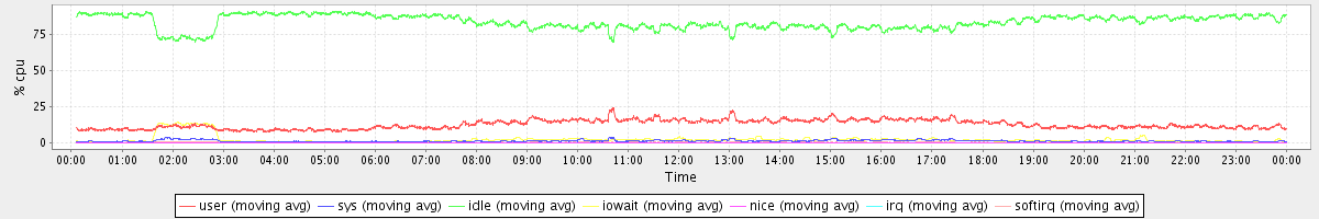 avg(user) = 12.64 avg(sys) = 1.23 avg(idle) = 83.58 avg(iowait) = 2.25 avg(nice) = 0.00 avg(irq) = 0.01 avg(softirq) = 0.28