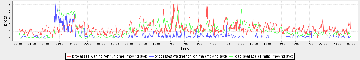 avg(processes waiting for run time) = 1.67 avg(processes waiting for io time) = 0.54 avg(load average (1 min)) = 2.23