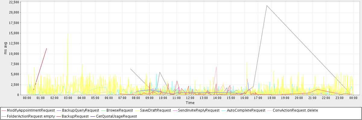 avg(ModifyAppointmentRequest) = 400.48 avg(BackupQueryRequest) = 620.00 avg(BrowseRequest) = 756.50 avg(SaveDraftRequest) = 996.92 avg(SendInviteReplyRequest) = 559.25 avg(AutoCompleteRequest) = 588.92 avg(ConvActionRequest.delete) = 410.10 avg(FolderActionRequest.empty) = 1835.16 avg(BackupRequest) = 5998.50 avg(GetQuotaUsageRequest) = 3009.00