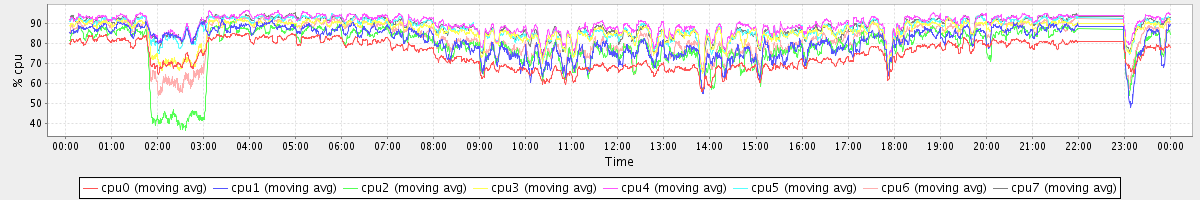 avg(cpu0) = 74.52 avg(cpu1) = 81.00 avg(cpu2) = 77.98 avg(cpu3) = 86.00 avg(cpu4) = 89.74 avg(cpu5) = 87.74 avg(cpu6) = 82.24 avg(cpu7) = 88.16