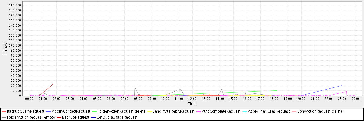 avg(BackupQueryRequest) = 646.17 avg(ModifyContactRequest) = 930.96 avg(FolderActionRequest.delete) = 4996.50 avg(SendInviteReplyRequest) = 560.54 avg(AutoCompleteRequest) = 495.46 avg(ApplyFilterRulesRequest) = 179091.00 avg(ConvActionRequest.delete) = 278.93 avg(FolderActionRequest.empty) = 1664.72 avg(BackupRequest) = 12006.00 avg(GetQuotaUsageRequest) = 1241.00