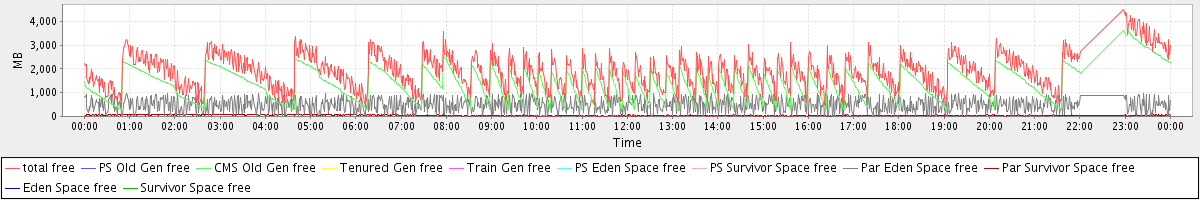 avg(total free) = 1909.61 avg(PS Old Gen free) = 0.00 avg(CMS Old Gen free) = 1373.61 avg(Tenured Gen free) = 0.00 avg(Train Gen free) = 0.00 avg(PS Eden Space free) = 0.00 avg(PS Survivor Space free) = 0.00 avg(Par Eden Space free) = 491.85 avg(Par Survivor Space free) = 44.15 avg(Eden Space free) = 0.00 avg(Survivor Space free) = 0.00