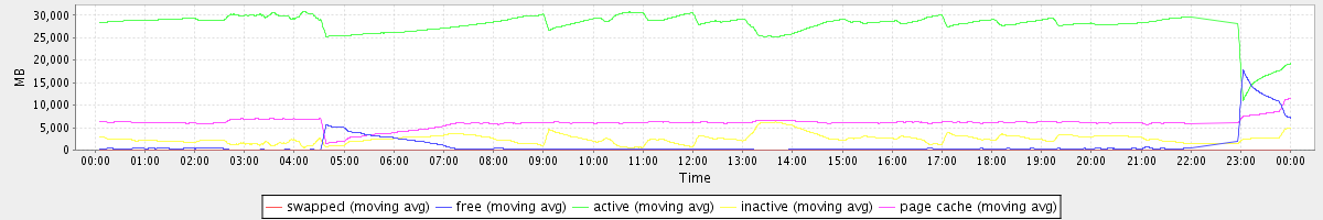 avg(swapped) = 0.25 avg(free) = 1078.67 avg(active) = 27854.42 avg(inactive) = 2532.19 avg(page cache) = 6055.53