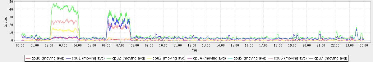 avg(cpu0) = 0.77 avg(cpu1) = 4.15 avg(cpu2) = 8.26 avg(cpu3) = 1.36 avg(cpu4) = 0.40 avg(cpu5) = 0.42 avg(cpu6) = 5.07 avg(cpu7) = 0.42