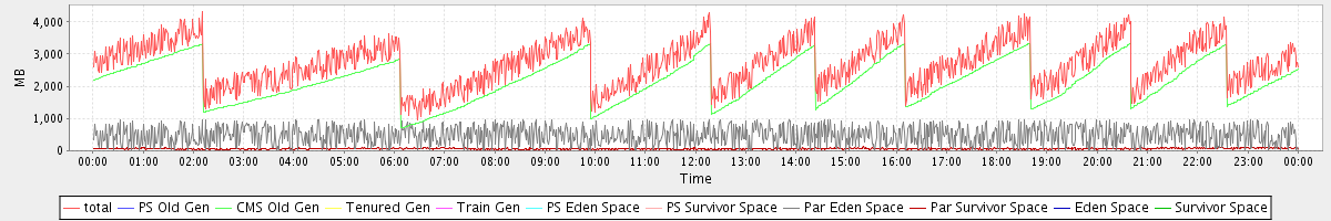 avg(total) = 2720.28 avg(PS Old Gen) = 0.00 avg(CMS Old Gen) = 2174.82 avg(Tenured Gen) = 0.00 avg(Train Gen) = 0.00 avg(PS Eden Space) = 0.00 avg(PS Survivor Space) = 0.00 avg(Par Eden Space) = 482.60 avg(Par Survivor Space) = 62.86 avg(Eden Space) = 0.00 avg(Survivor Space) = 0.00