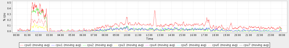 avg(cpu0) = 0.09 avg(cpu1) = 0.02 avg(cpu2) = 0.04 avg(cpu3) = 0.01 avg(cpu4) = 0.00 avg(cpu5) = 0.00 avg(cpu6) = 0.02 avg(cpu7) = 0.00