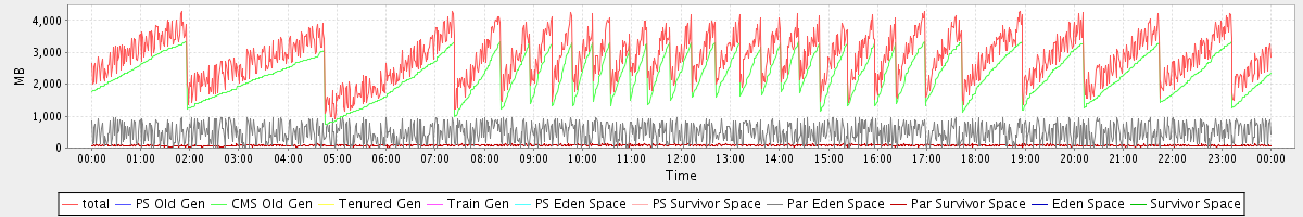 avg(total) = 2839.57 avg(PS Old Gen) = 0.00 avg(CMS Old Gen) = 2270.32 avg(Tenured Gen) = 0.00 avg(Train Gen) = 0.00 avg(PS Eden Space) = 0.00 avg(PS Survivor Space) = 0.00 avg(Par Eden Space) = 485.67 avg(Par Survivor Space) = 83.57 avg(Eden Space) = 0.00 avg(Survivor Space) = 0.00