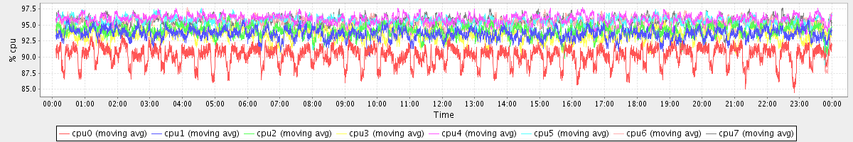 avg(cpu0) = 90.20 avg(cpu1) = 93.59 avg(cpu2) = 94.09 avg(cpu3) = 93.37 avg(cpu4) = 95.85 avg(cpu5) = 95.49 avg(cpu6) = 95.26 avg(cpu7) = 95.49